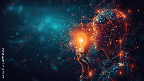 A digital representation of a person holding a glowing light bulb, symbolizing ideas and innovation.