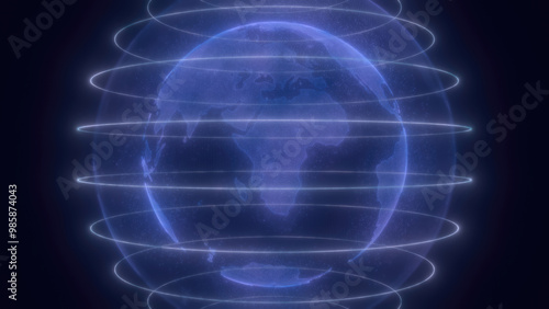 A digital representation of blue Earth with glowing lines encircling the planet, highlighting global connectivity and technology