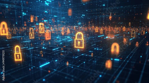A digital representation of cyber insurance coverage, with a network of locks and data streams.