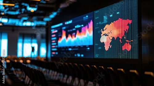 A digital screen displaying a pitch deck with graphs and key takeaways in a conference hall.