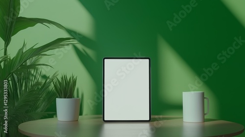 A digital tablet with a white screen mockup and decor on a table against a green wall in a room.