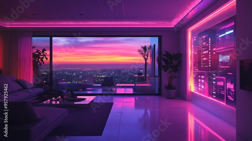 A digital water meter panel seamlessly integrated into a smart apartment, with holographic projections and futuristic UI elements, surrounded by minimalist decor, Tech-inspired, Cool neon glow