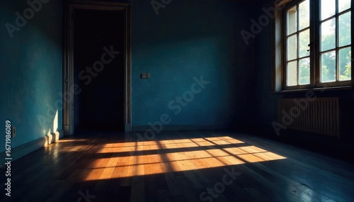 A dimly lit interior space, shadows stretching across the floor, suggesting a late hour indoors The scene evokes a feeling of quiet solitude and the stillness of night , window, ambiance