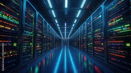 A dimly lit server room features rows of illuminated servers, showcasing a high-tech environment with vibrant lights.
