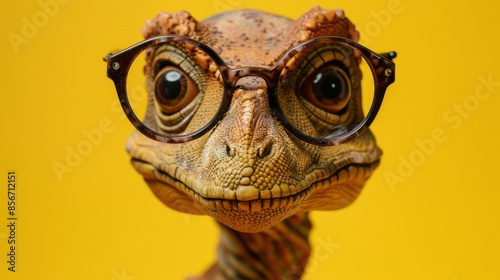 A Dinosaur Wearing Glasses on a Yellow Background
