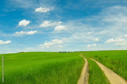 A dirt road in a green field with blue sky. A field of clouds and grass in the sky. Green field with blue sky and nature on the road. Green field with green grass and clouds lifestyle on the road.