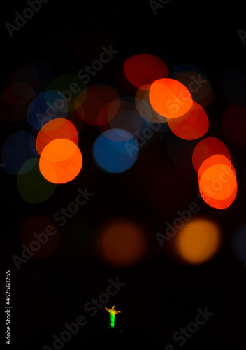 A distant Christ the Redeemer statue with blurred city lights on the foreground, Rio de Janeiro, Brazil