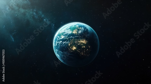 A distant view of Earth in space, its blue and green surface glowing brightly against the blackness of the universe