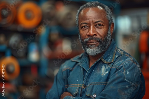 A distinguished mature man with a beard poses confidently in a lively workshop surrounded by tools and equipment, reflecting a sense of skill, experience, and dedication to his craft.