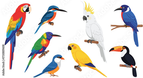 A diverse collection of vibrant tropical birds perched on branches.