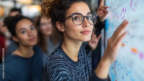 A diverse group of employees collaborating around a digital whiteboard in a modern office space. The scene is captured from a distance with a blurred object in the foreground, creating a hidden
