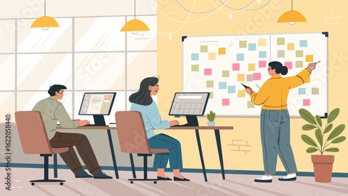 A diverse team collaborates in a bright, modern office, brainstorming ideas and planning strategies using sticky notes on a whiteboard for project management.