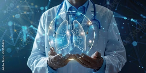 a doctor holding human lungs anatomy inside transparent round shield protection futuristic with light on transparent blue background