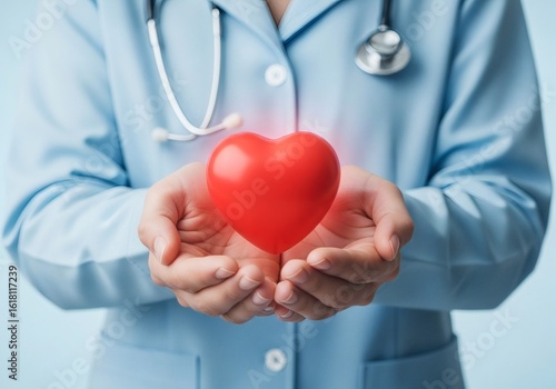A doctor holds a glowing red heart in cupped hands wearing a blue coat