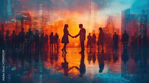 A double exposure illustration depicts business people shaking hands and engaging in conversation, emphasizing the importance of community building in digital marketing