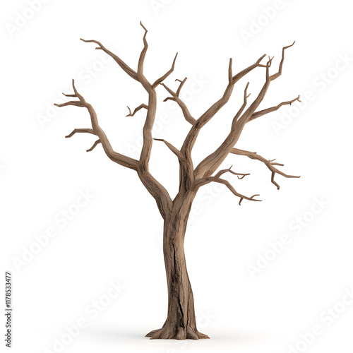 A dramatic 3D representation of a dead tree, characterized by its sharply angled branches and weathered trunk. Every detail, from the cracks in the bark to the jagged branch ends, is rendered in