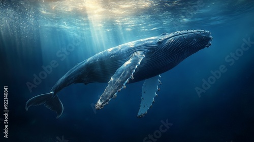 A dramatic scene of a massive humpback whale gliding beneath the surface of a deep blue ocean. The immense size and the play of light through the water create a sense of grandeur and mystery.