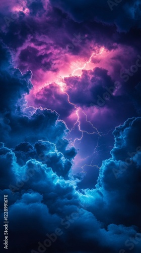 A dramatic scene with striking lightning cutting through dark clouds. Colors of purple and blue create a moody atmosphere. Perfect for backgrounds or themes. Generative AI