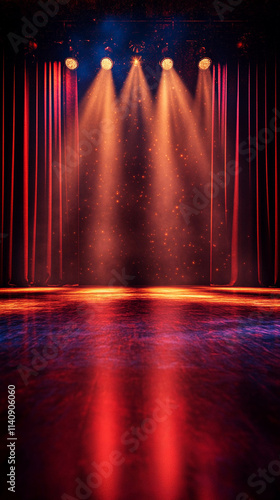 A dramatic stage scene with red curtains and bright spotlights illuminating the wooden floor. The atmosphere is vibrant and theatrical, perfect for performances.