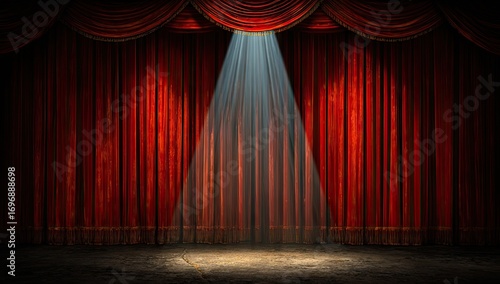 A dramatic stage set with crimson velvet curtains, illuminated by a spotlight, creating a captivating and theatrical atmosphere.