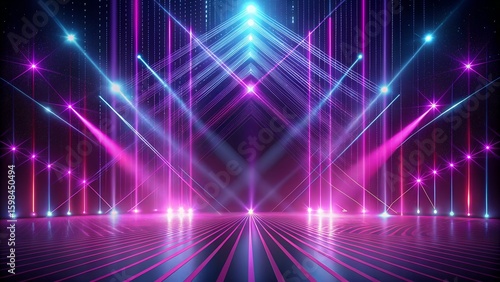 A dramatic stage with converging beams of vibrant blue and pink lights illuminates a reflective floor in a futuristic