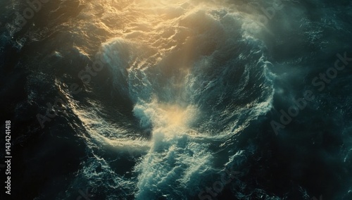 A dramatic, swirling ocean scene with a burst of golden light emerging from the depths