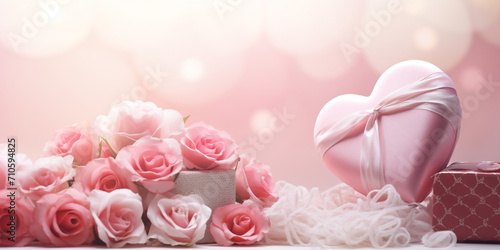 A dreamy and soft-focused image of a bouquet of delicate pink roses next to a collection of handcrafted hearts made of various materials like paper created with Generative Ai
