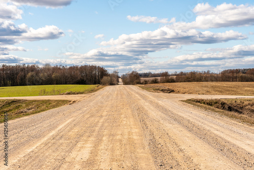 A dry sandy road passes through a field under the scorching sun and clouds. Dirt road outside the city in the village. Arid climate on earth. Climate change and its consequences.