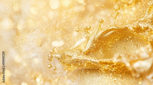 A dynamic cascade of gold liquid and glitter flows gracefully, sparkling and shimmering wildly, creating an enchanting visual spectacle