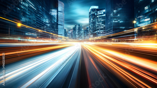 A dynamic cityscape with light trails from vehicles.