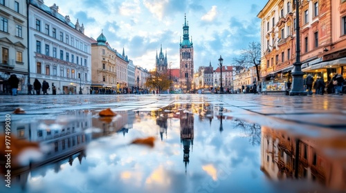 A European city square featuring beautiful historic buildings and a church tower is captured at dawn, with the wet pavement creating mesmerizing reflections of the scenery.