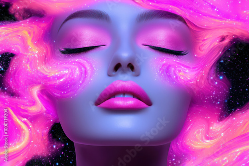 A face glowing with a vibrant smile, A dreamy model with vibrant pink hair against a cosmic background, showcasing beauty and creativity in a surreal style.