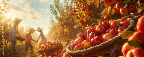 A family enjoying a day of apple picking at a scenic orchard, filling baskets with ripe fruit under the autumn sun.