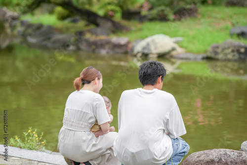 A family of three sits on a rock by a pond, with a baby in the middle. The man and woman are looking at the baby, and the baby is looking at the camera. The scene is peaceful and serene