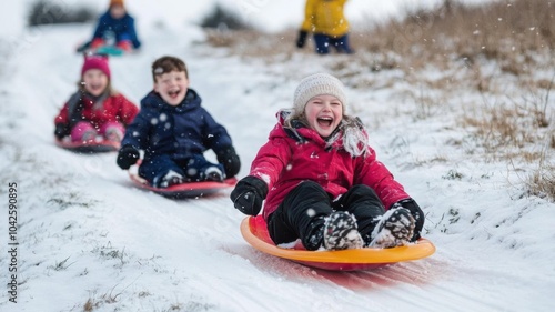 A family tobogganing down snowy hills, with children laughing as they race downhill