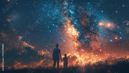 A father and son stand side by side, gazing up at the starry sky with determination in their eyes. The night is dark but full of stars, symbolizing hope for future