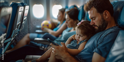 A father holding his daughter in his arms falls asleep watching a phone during their flight. Concept of family travel, child care, and jet lag.
