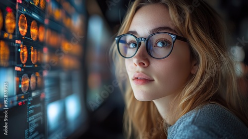A female engineer analyzes satellite data using a computer, representing aerospace and space mission planning.