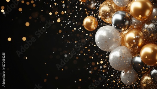 A Festive Background of Shimmering Metallic Balls in Gold, Silver, and White with Glimmering Glitter Particles on a Dark Surface for Celebrations