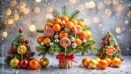 A Festive Christmas Tree Arrangement Featuring Miniature Trees, Candy Canes, and Sparkling Ornaments