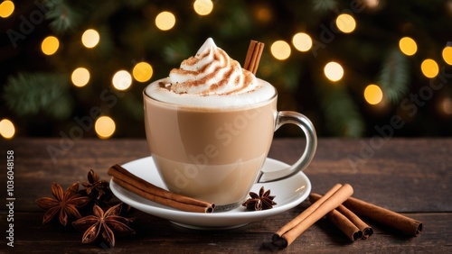 A festive cup of holiday spiced latte with whipped cream and cinnamon sticks, perfect for cozy winter or Christmas themes