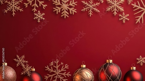 A festive holiday background with shimmering snowflakes, golden ornaments, and a rich red backdrop, elegant and luxurious, digital painting