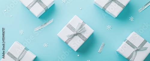 A festive Merry Christmas and Happy Holidays greeting card, frame, and banner celebrating New Year and Noel. The card features white and golden ornaments and gifts on a blue background, presented in