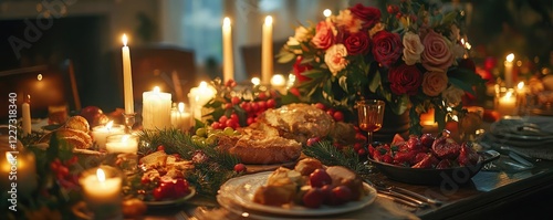 A festive table set with candles, flowers, and a holiday feast