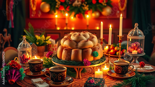 A festive table setting with a towering cake, lit candles, and ornate decorations, creating a warm and inviting atmosphere