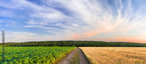 A field road between a green field of soybeans and a golden field of ripe barley. Beautiful summer panoramic agricultural landscape