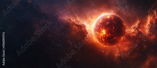 A fiery planet in a dark space.