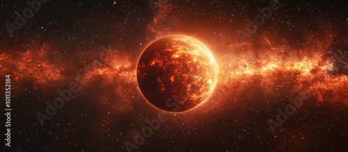 A fiery planet in a vast expanse of space with a nebula in the background.