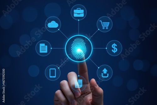 A fingertip interacts with a digital interface, showcasing various interconnected digital icons, representing secure digital transactions and online services.