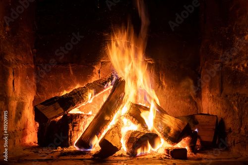 A fire burns in a fireplace, Fire to keep warm